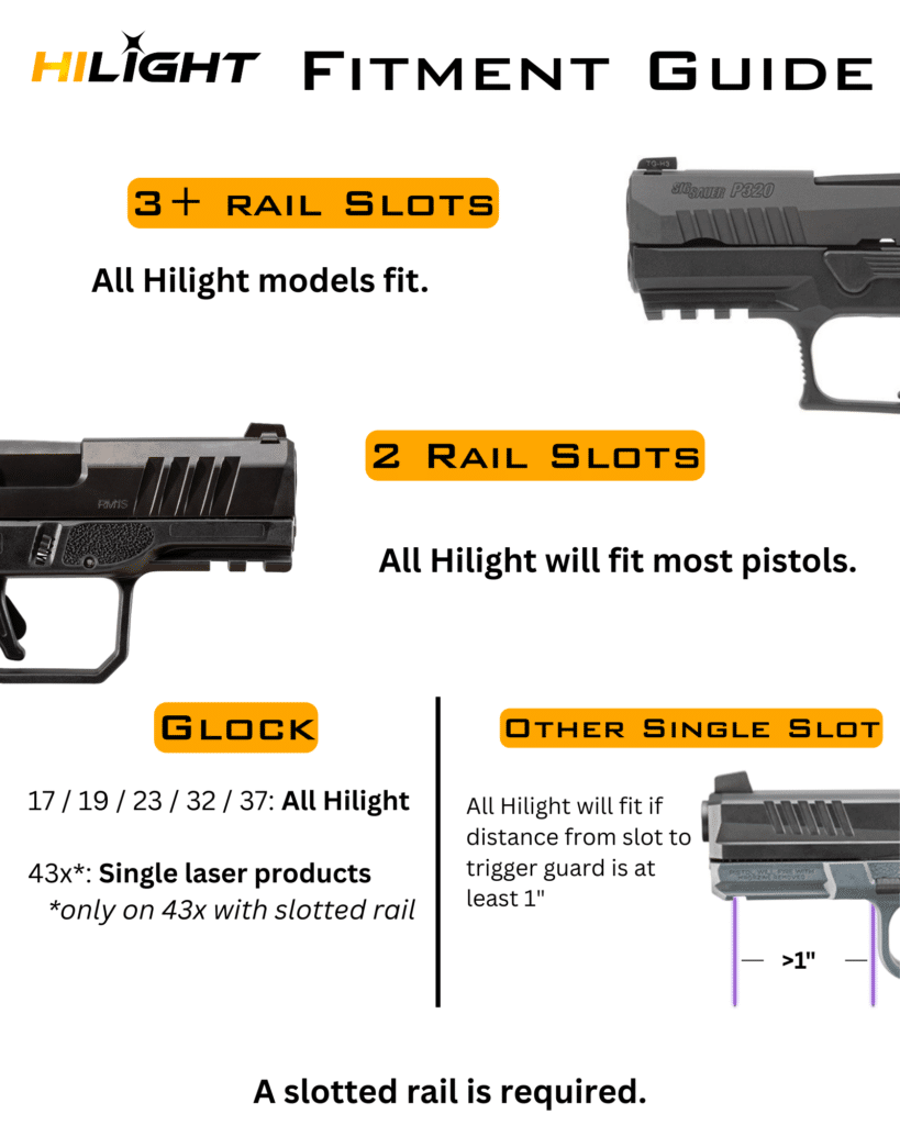 Quick rule of thumb: if your gun has at least 2 slots on the mounting rail, nearly all Hilight units will fit though some will extend past the barrel. If it has 3 slots, all Hilight units will fit. The only exception would be in the case of certain curved trigger guards. Returns are always FREE with Hilight so please do not hesitate even if you think it might not fit.